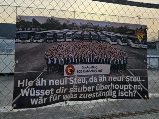 Die Berner Fans sind die ganze Saison hindurch immer mal wieder enttäuscht und wohl auch etwas verärgert worden. Anders sind solche Sprüche wie hier auf dem Foto nicht zu deuten. Doch wie heisst es so schön? Nach dem Regen kommt die Sonne. Und in der Sonne darf man...